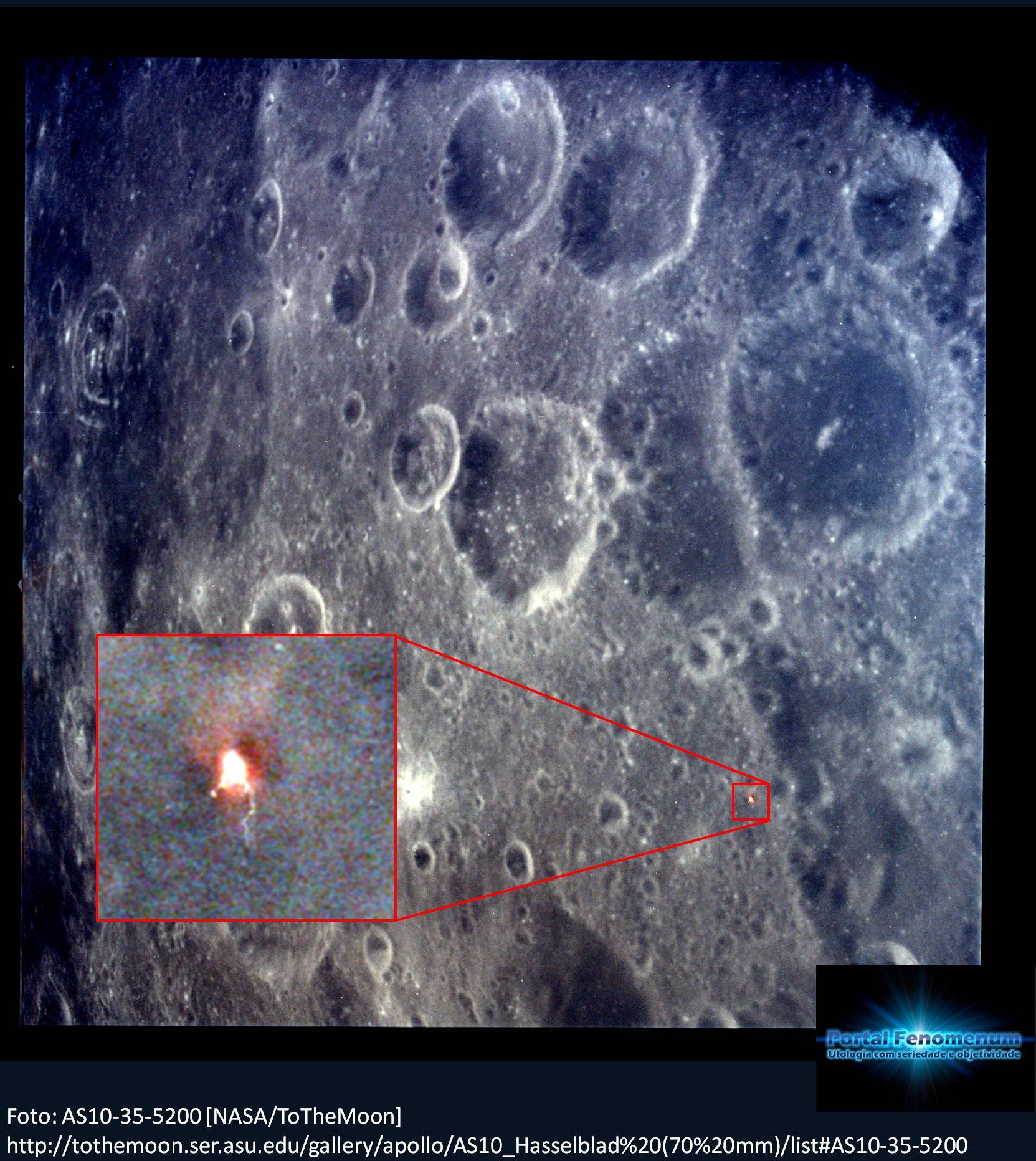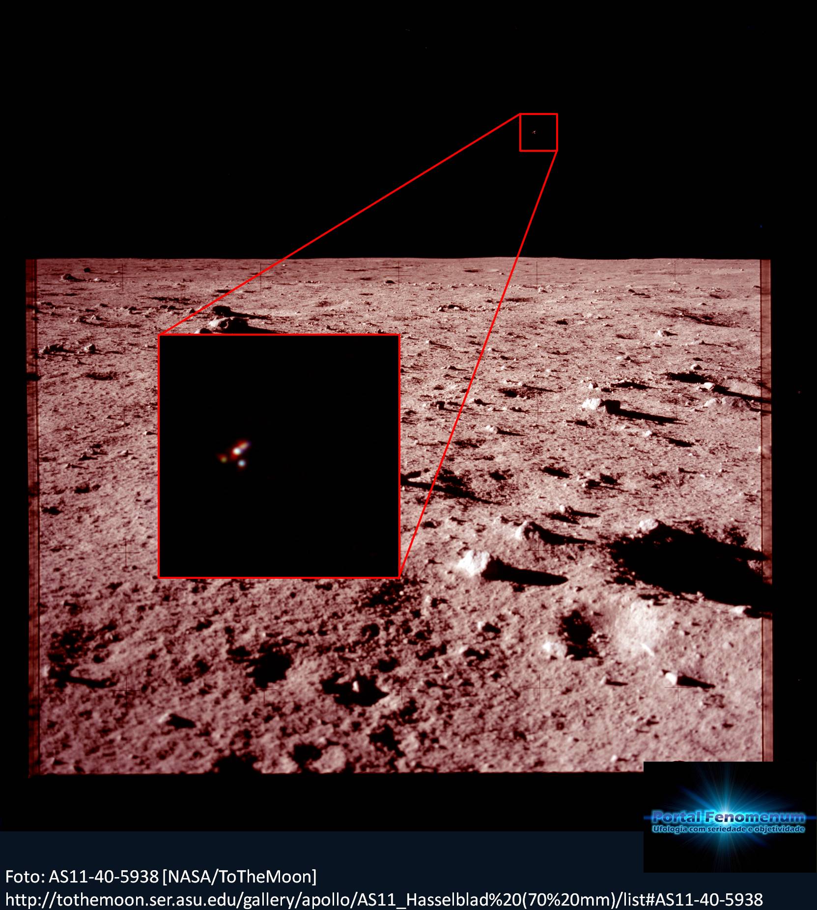 Assim, algumas poucas imagens foram descobertas pelos ufólogos e divulgadas até hoje como provas de atividade alienígena na superfície lunar. Tal é o caso das fotografias AS11-36-5319, AS16-120-19238 e AS12-50-7340. A primeira mostra um objeto luminoso, no espaço, próximo ao nosso planeta. A segunda imagem mostra o que seria um nave mãe alienígena sobre a superfície lunar. A terceira imagem registraria um disco voador luminoso que teria acompanhado a Apollo 12 quando aproximava-se do nosso satélite natural.