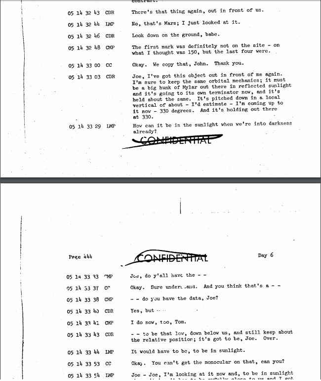 Trecho do documento Apollo 10 Onboard Voice Transcription-Command Module, contendo comunicações travadas durante avistamento ufológico.