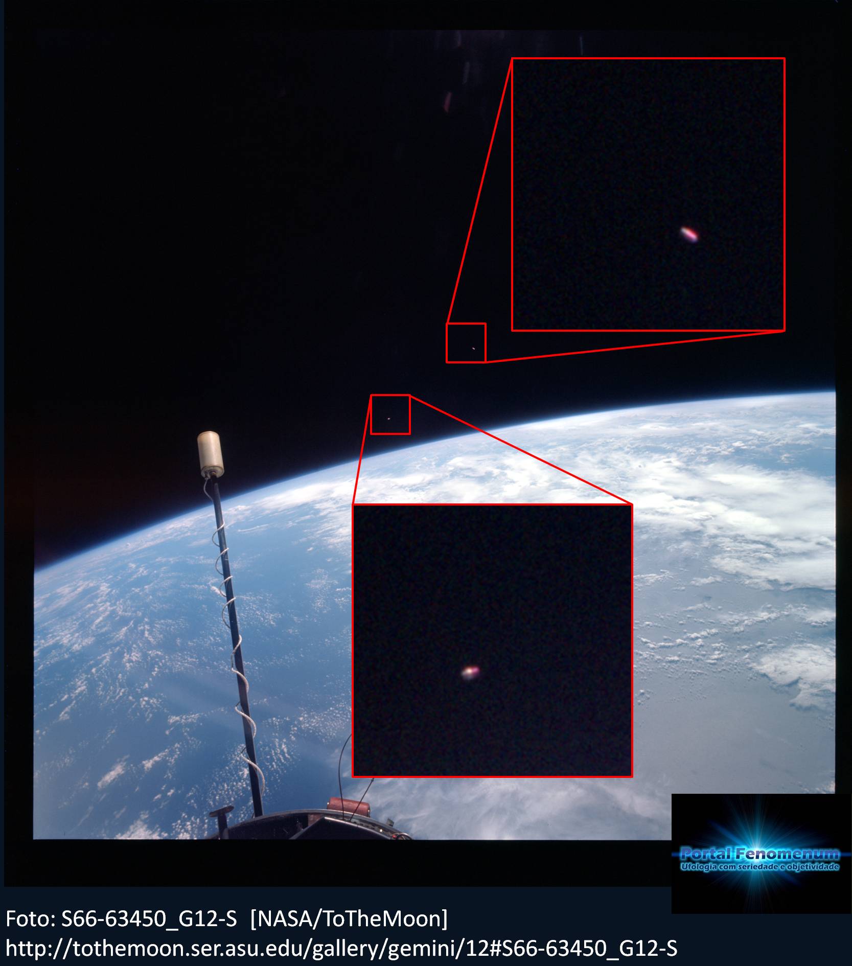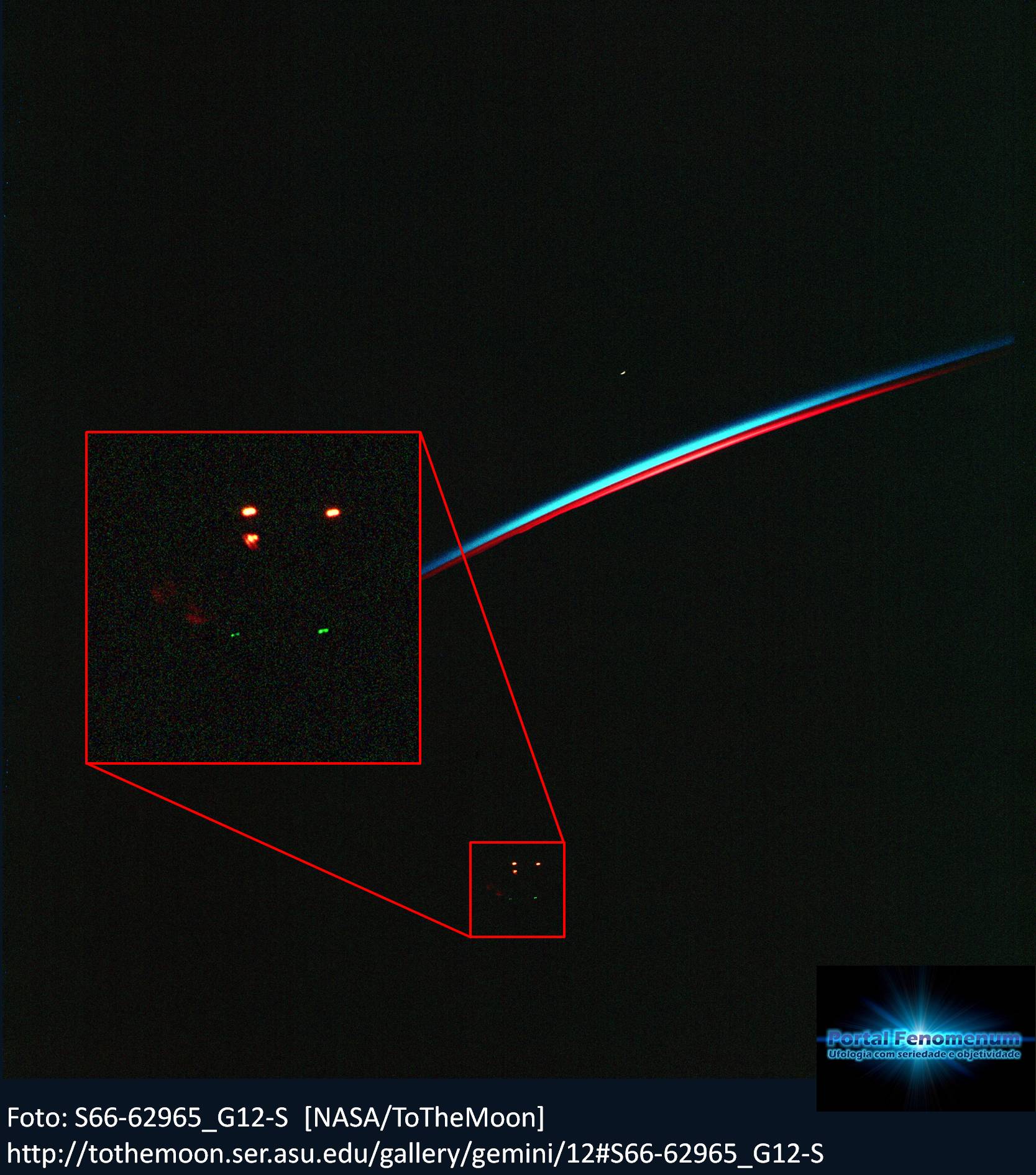 Vários objetos luminosos, fotografados pelos astronautas da Gemini 12. Estas imagens fazem parte de uma grande sequencia de registros ufológicos.