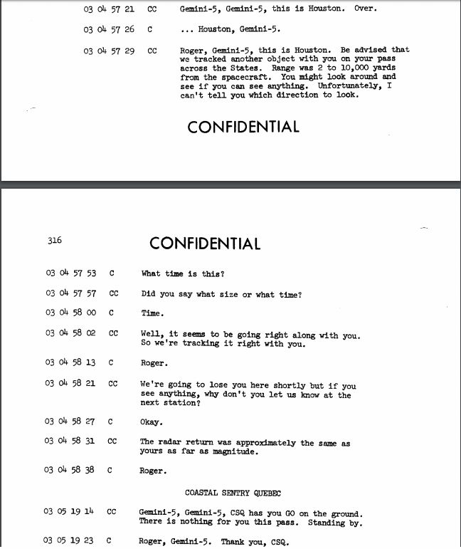 Trecho do arquivo oficial da NASA, outrora confidencial, onde consta as transcrições das comunicações no momento do avistamento ufológico.