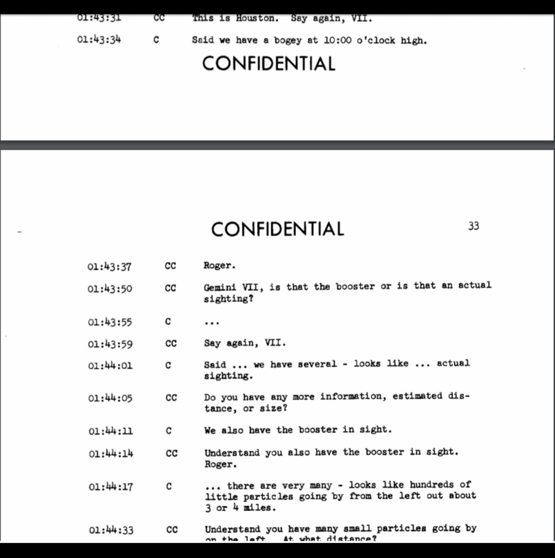 Trecho do documento Gemini VII Composite Air-to-Ground and Onboard Voice Tape Transcription, Vol. 1, contendo comunicações travadas durante avistamento ufológico.